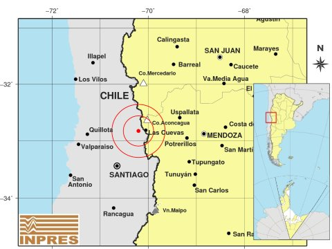 El Inpres, señaló que el epicentro fue a 128 kilómetros al Oeste de Mendoza; a 216 kilómetros al SurOeste de San Juan; y a 15 kilómetros al Oeste de Las Cuevas.