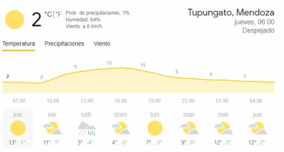 Para Tunuyán y los departamentos del Valle de Uco, el SMN prevé una jornada con cielo despejado y una máxima que está prevista en los 13º. Mañana se espera máxima de 11º y cielo parcialmente nublado.