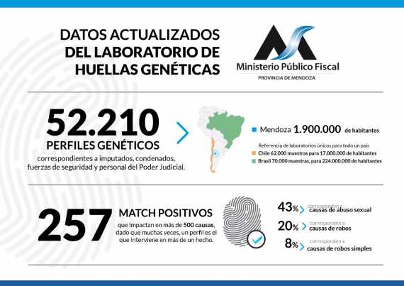 A la fecha, el Registro Provincial de Huellas Genéticas tiene en su base de datos, los perfiles genéticos de 52.210 personas. Las muestras fueron extraídas a imputados y condenados por diversos delitos, fuerzas de seguridad y funcionarios del Poder Judicial. Así, el laboratorio mendocino se posiciona entre los más avanzados de Latinoamérica en materia de base de datos, tomando en cuenta la relación de muestras respecto a la población.