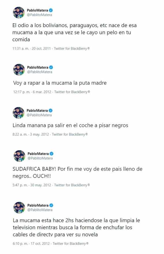 Matera debió cerrar su perfil de Twitter por las interacciones negativas de posteos discriminatorios descubiertos en su cuenta por distintos usuarios, según consignó la agencia Noticias Argentinas. Mensajes igualmente repudiables fueron recuperados de los perfiles de Guido Petti (también borró su cuenta), Mayco Vivas y Santiago Socino, otros tres miembros del plantel argentino. En todos los casos, el contenido estigmatiza por nacionalidad y raza.