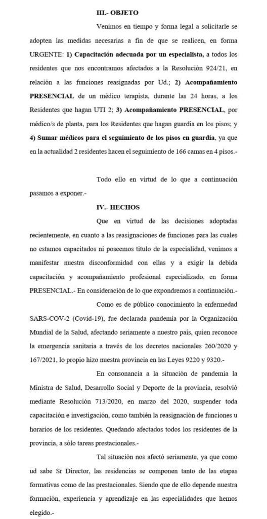 "Consentimos que nos apartaran en muchos casos de nuestras residencias quedando afectados en la guardia central y atención a pacientes con covid-19, siendo que muchas veces resultaban más guardias y carga horaria a la fijada por la Ley 7857", señala la carta.