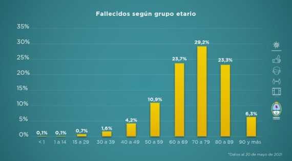 Asimismo, el grupo etario más vulnerable frente a la enfermedad sigue siendo el de los adultos mayores. El 76,2% de los fallecidos tiene entre 60 años y 89 años y las personas de más de 90 años representa el 6,3%.