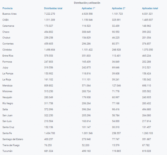 De acuerdo a los datos del Monitor Público de Vacunación, el registro online que muestra en tiempo real el operativo de inmunización en todo el territorio argentino, hasta este domingo por la mañana fueron distribuidas 18.853.790 vacunas, de las cuales 16.286.902 ya fueron aplicadas: 12.991.480 personas recibieron la primera dosis y 3.295.422 ambas.