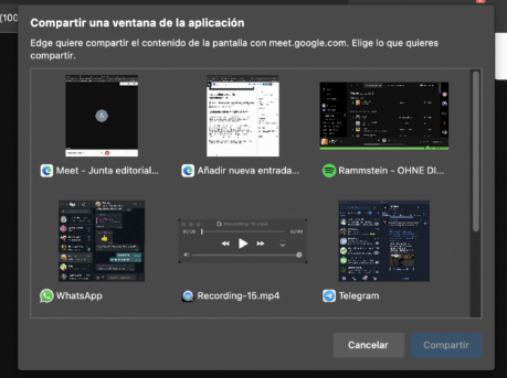 Si querés que todos vean exactamente lo mismo que lo que vos ves, entonces seleccioná "Toda tu pantalla", pero recordá que se verá todo, incluso las notificaciones de otras aplicaciones. La opción de una ventana selecciona un programa y comparte todo lo que se muestra ahí, mientras que para compartir solo una pestaña de tu navegador es necesario seleccionar "Una pestaña".